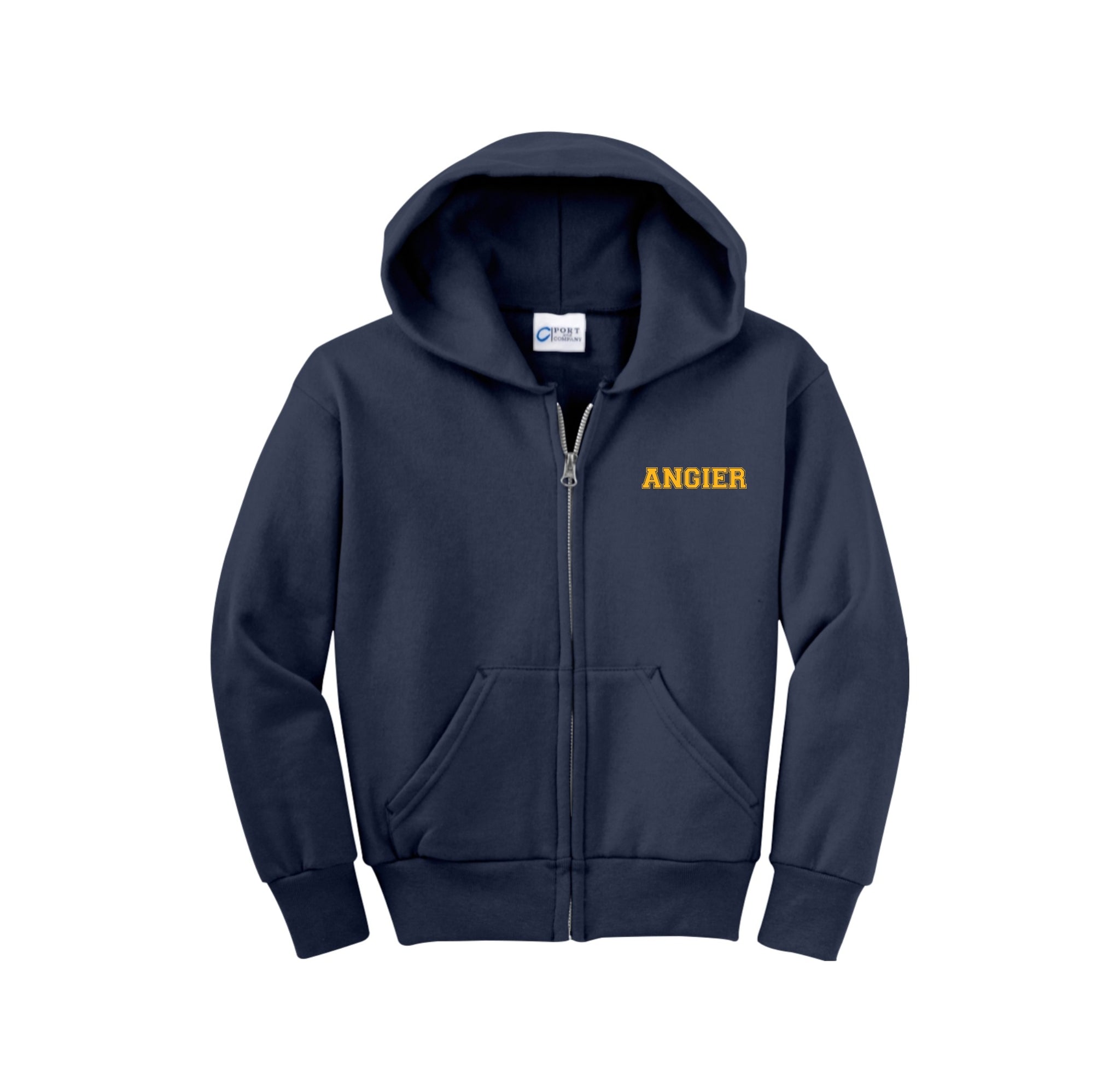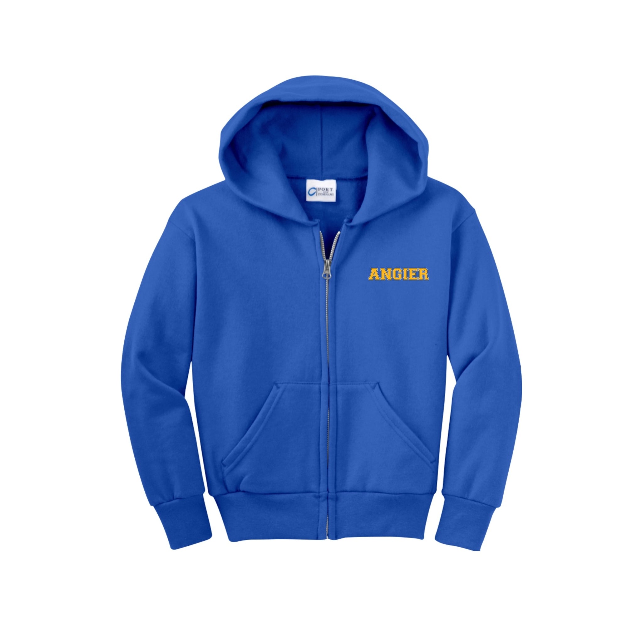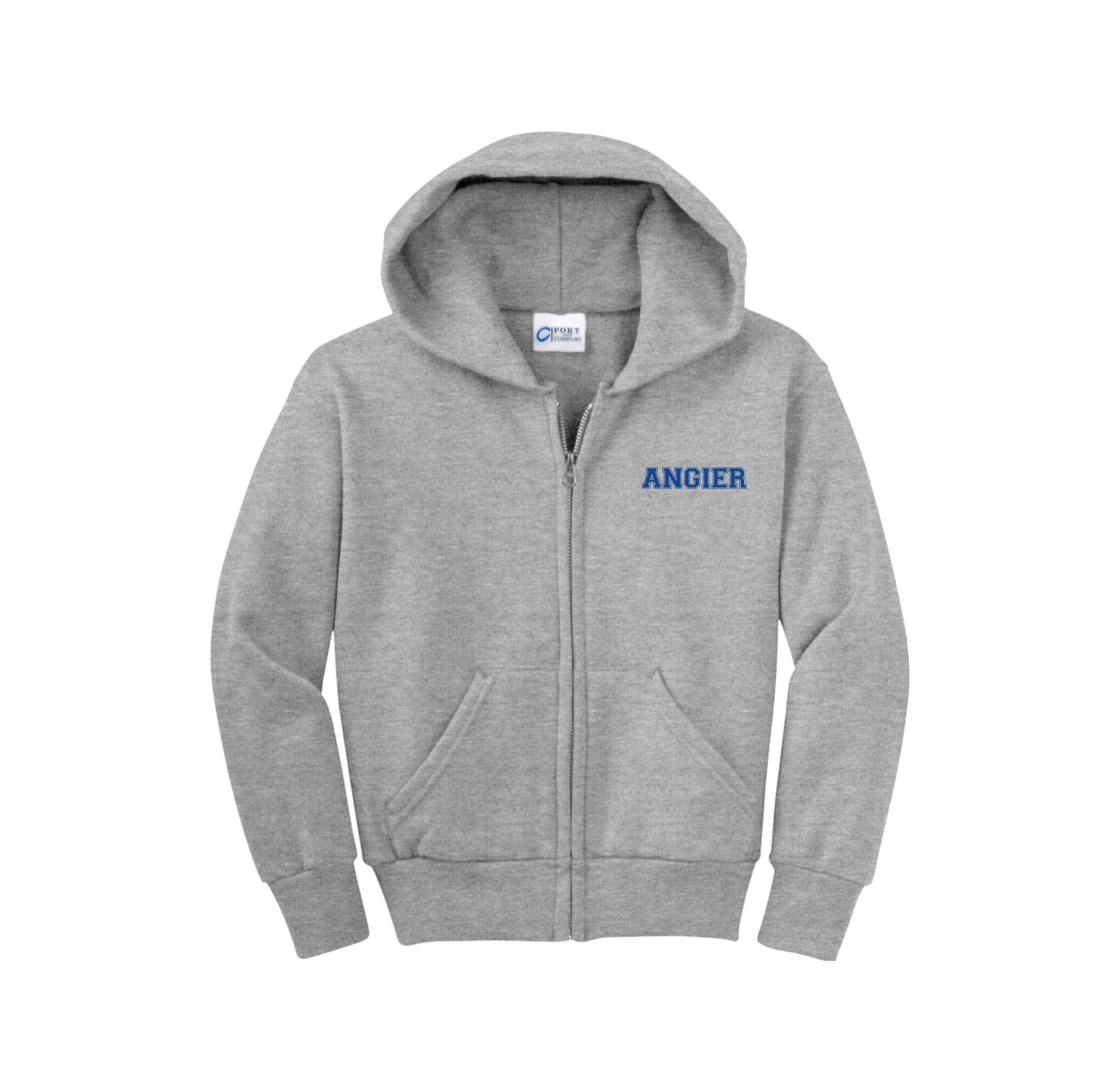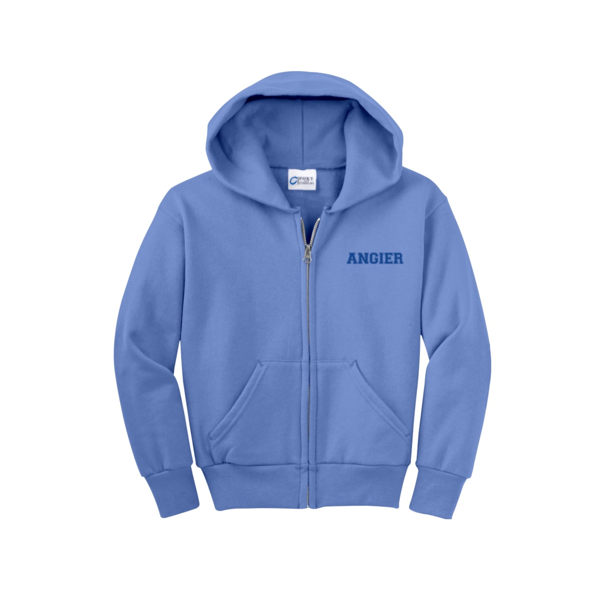 Stay cozy in our core-weight 7.8-ounce fleece hoodie, made from a soft 50/50 cotton/poly blend with air jet yarn, featuring a YKK metal zipper, front pockets, a removable tag for added comfort, and a two-ply hood with no drawcord.