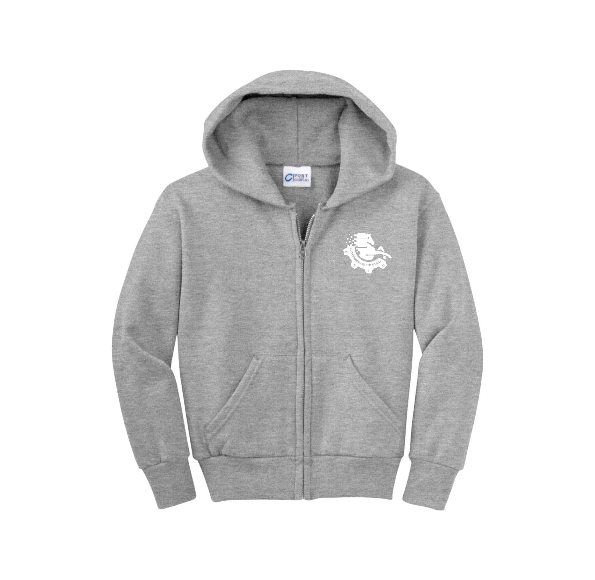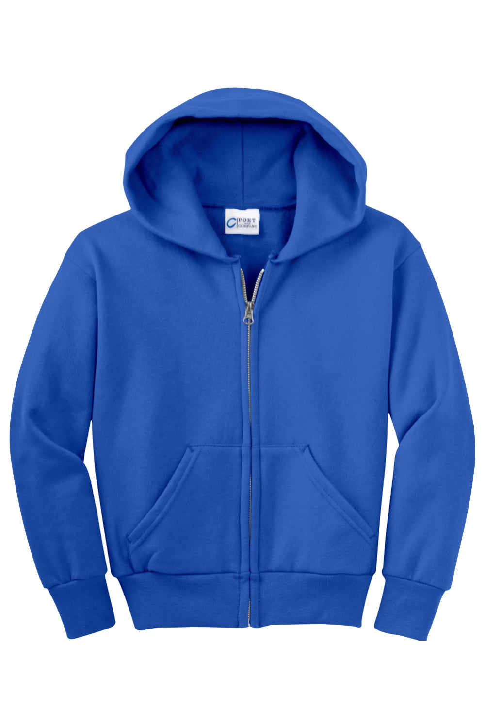 Stay cozy in our core-weight 7.8-ounce fleece hoodie, made from a soft 50/50 cotton/poly blend with air jet yarn, featuring a YKK metal zipper, front pockets, a removable tag for added comfort, and a two-ply hood with no drawcord.