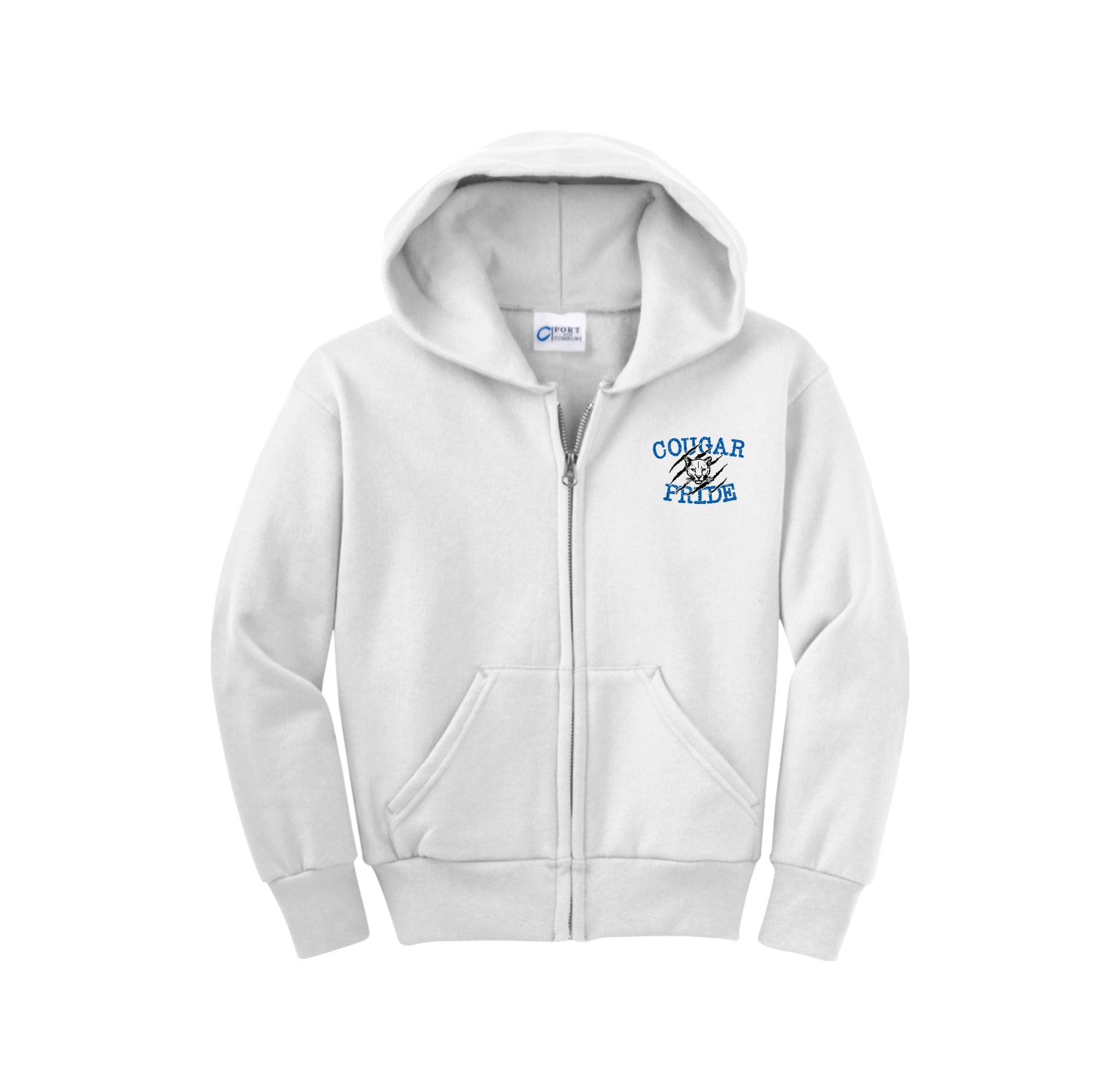 Stay cozy in our core-weight 7.8-ounce fleece hoodie, made from a soft 50/50 cotton/poly blend with air jet yarn, featuring a YKK metal zipper, front pockets, a removable tag for added comfort, and a two-ply hood with no drawcord.