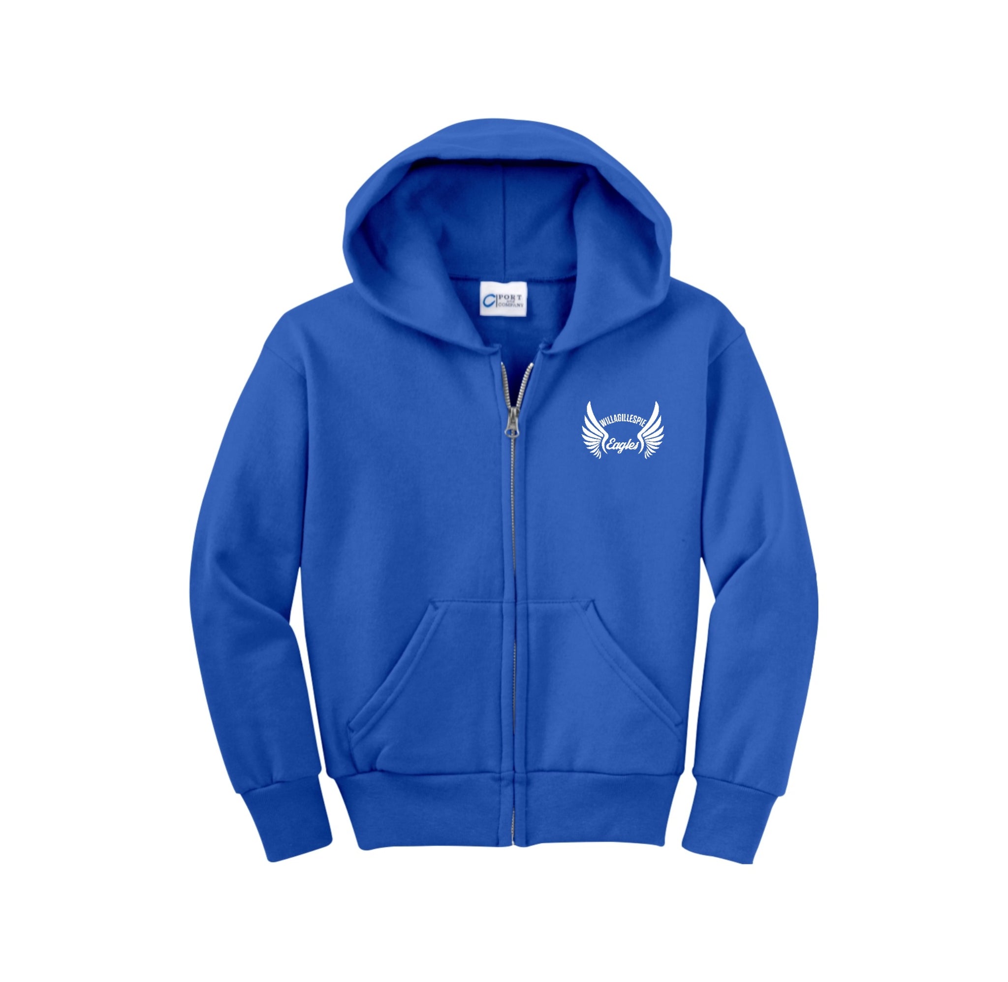 Stay cozy in our core-weight 7.8-ounce fleece hoodie, made from a soft 50/50 cotton/poly blend with air jet yarn, featuring a YKK metal zipper, front pockets, a removable tag for added comfort, and a two-ply hood with no drawcord.