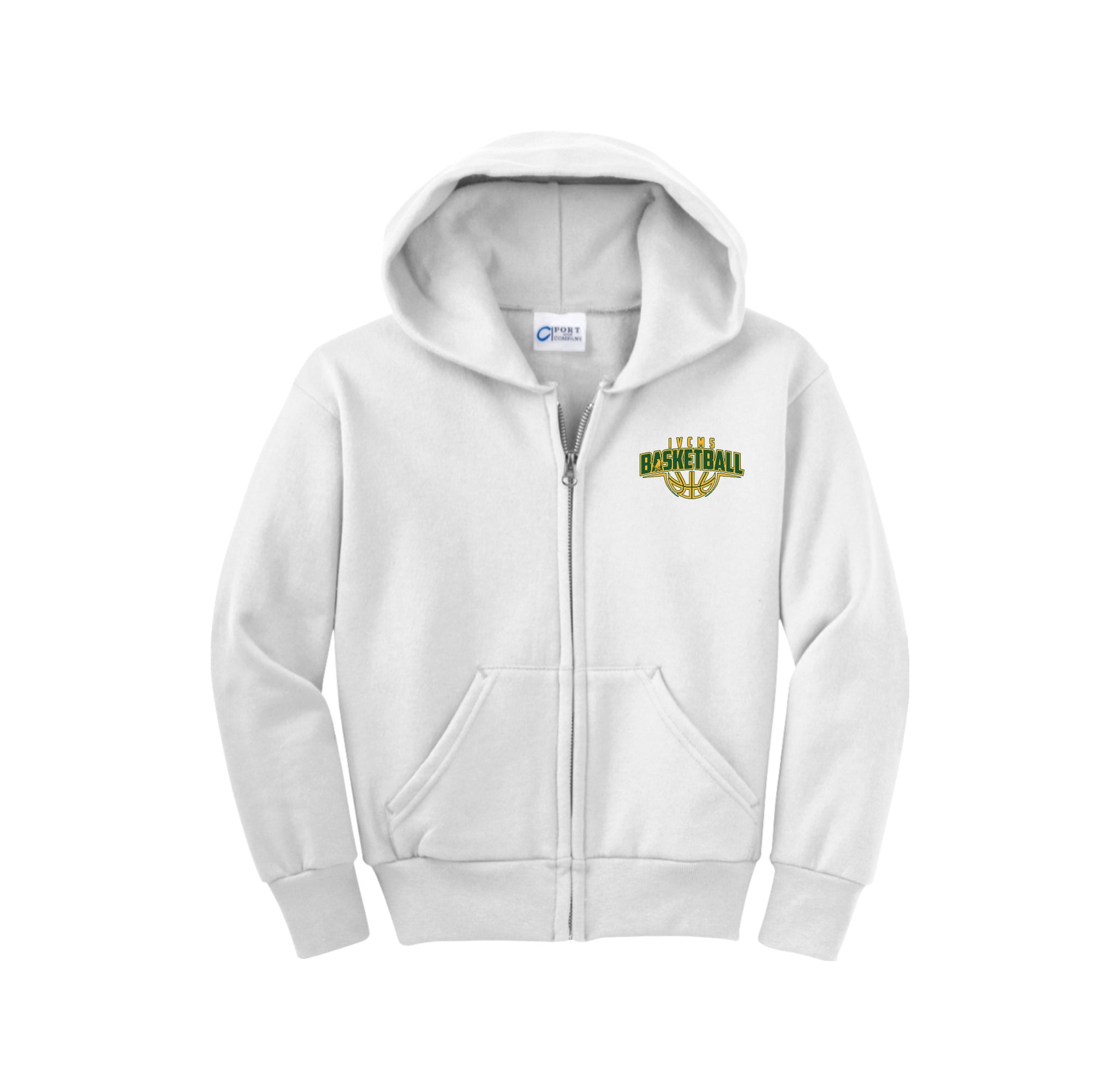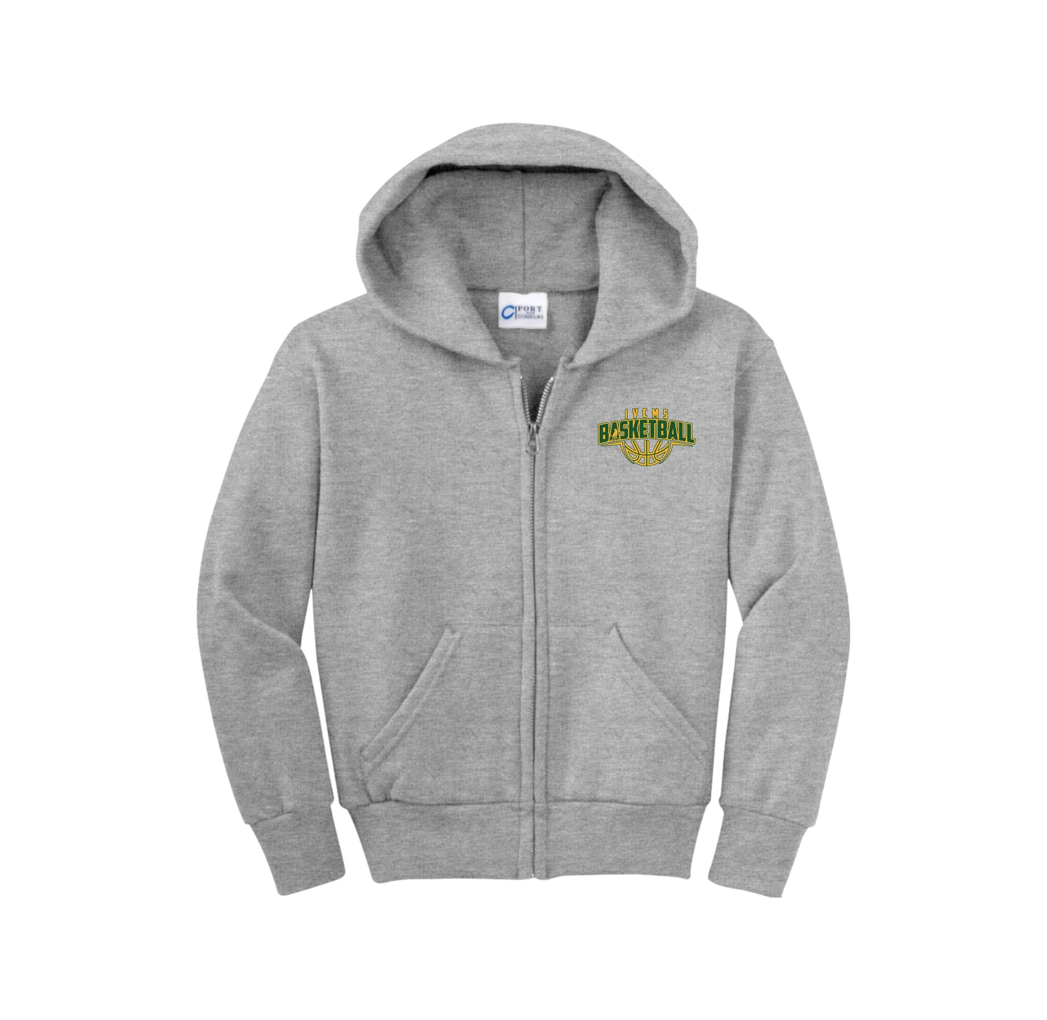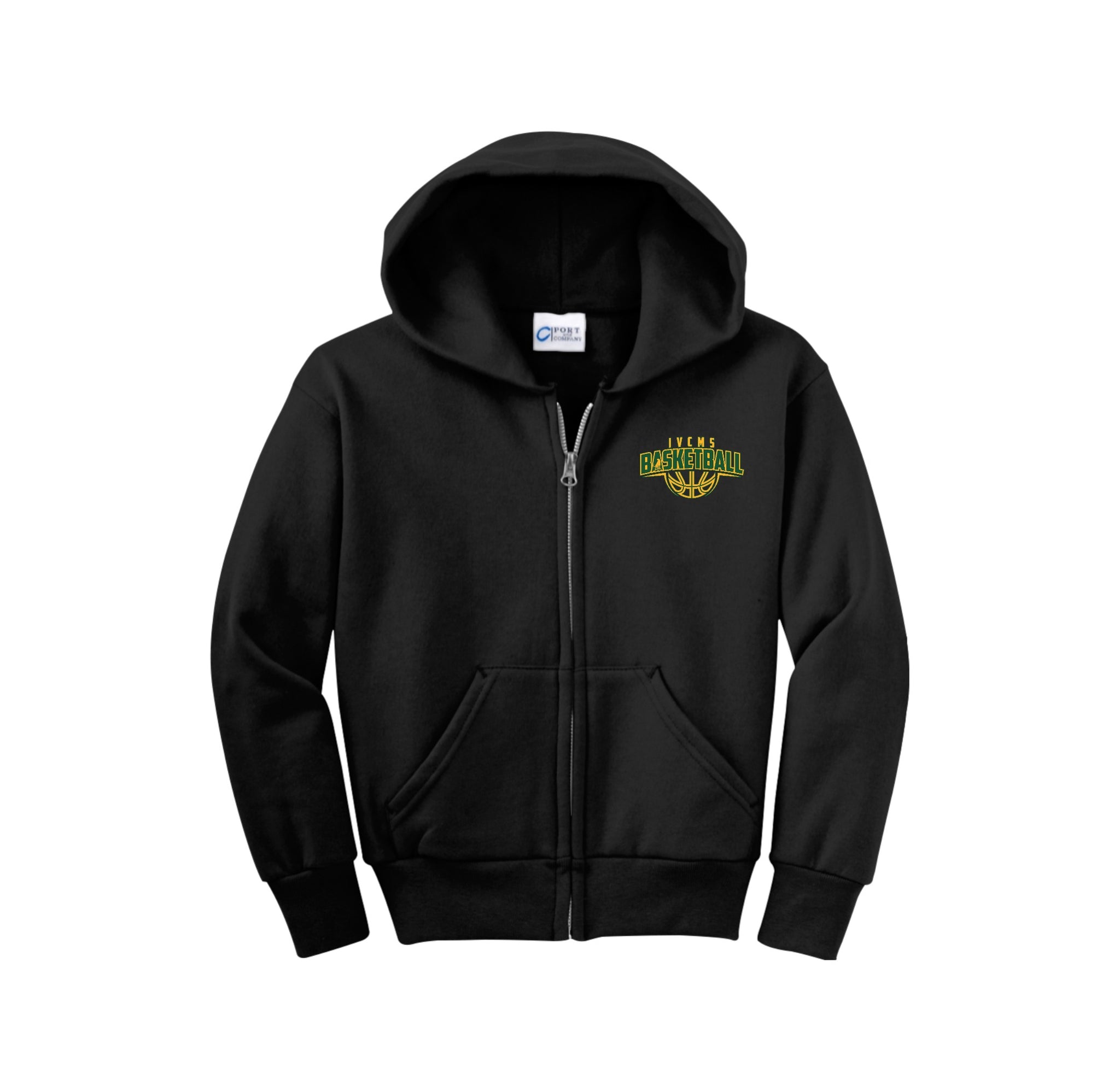 Itliong-Vera Cruz Middle School Athletics-Youth Port & Co Unisex Core Fleece Full-Zip Hooded Sweatshirt On-Demand Basketball Logo
