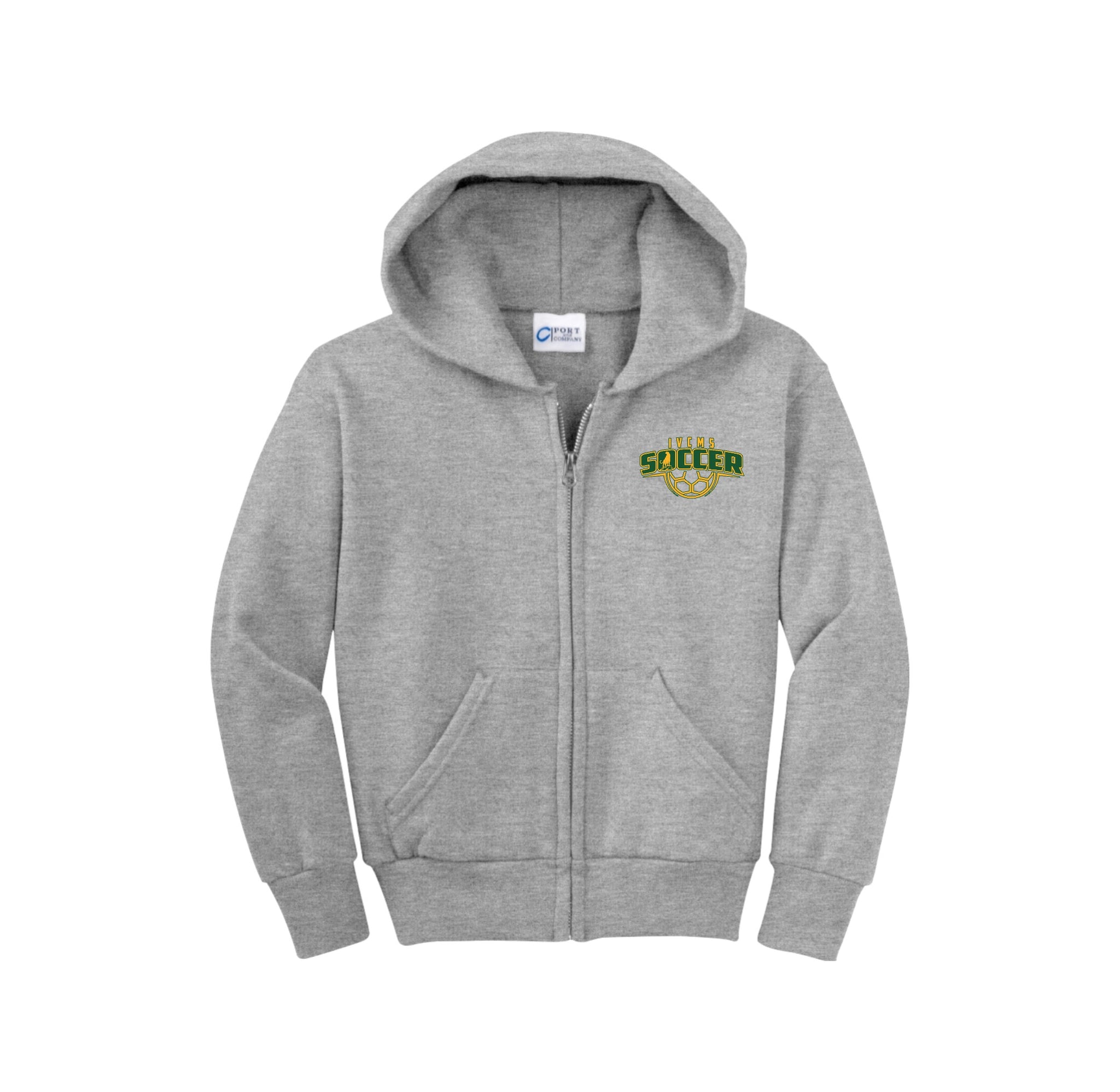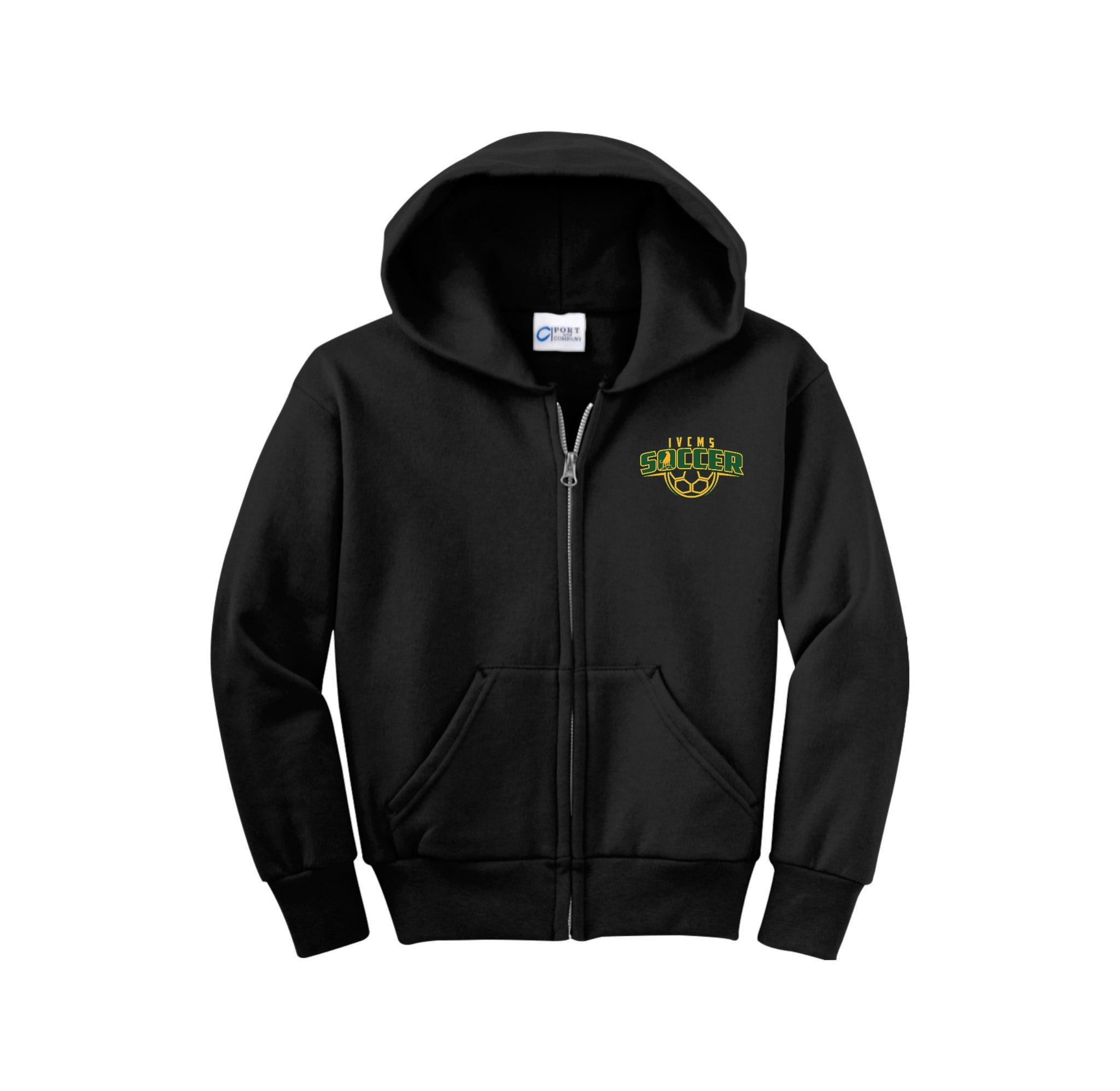 Itliong-Vera Cruz Middle School Athletics-Youth Port & Co Unisex Core Fleece Full-Zip Hooded Sweatshirt On-Demand Soccer Logo